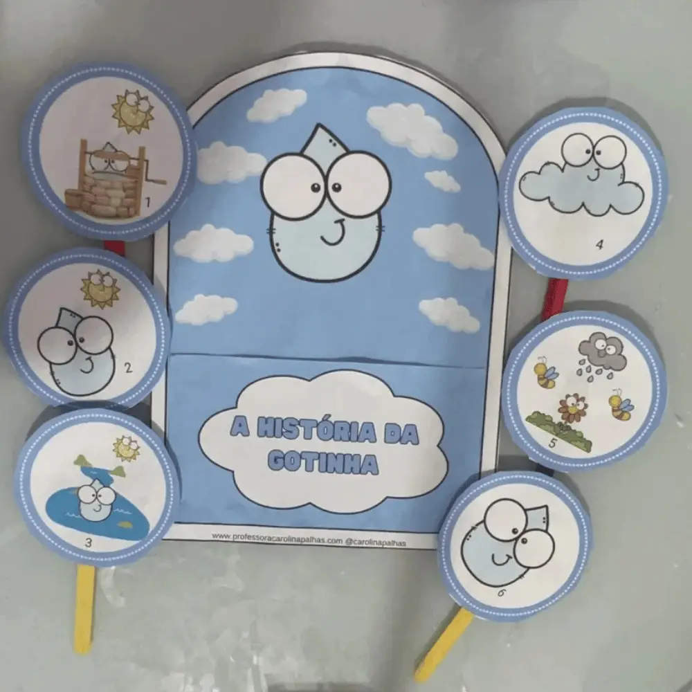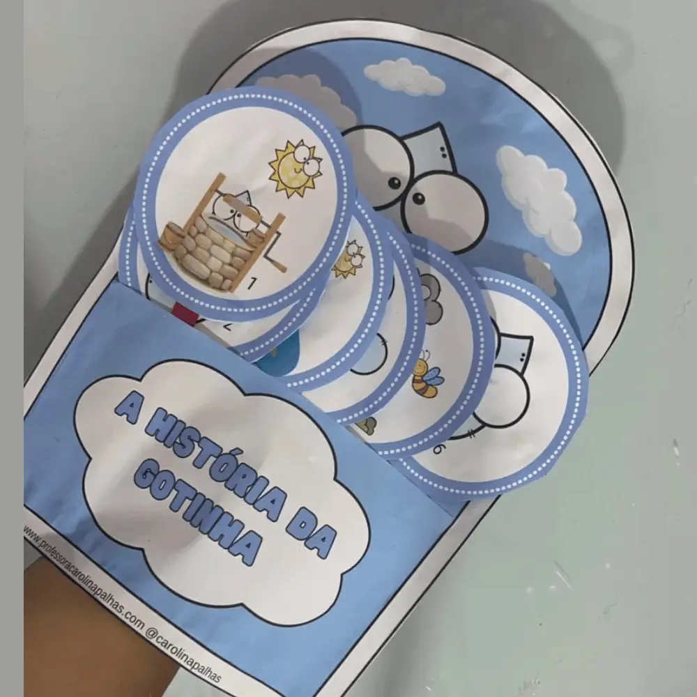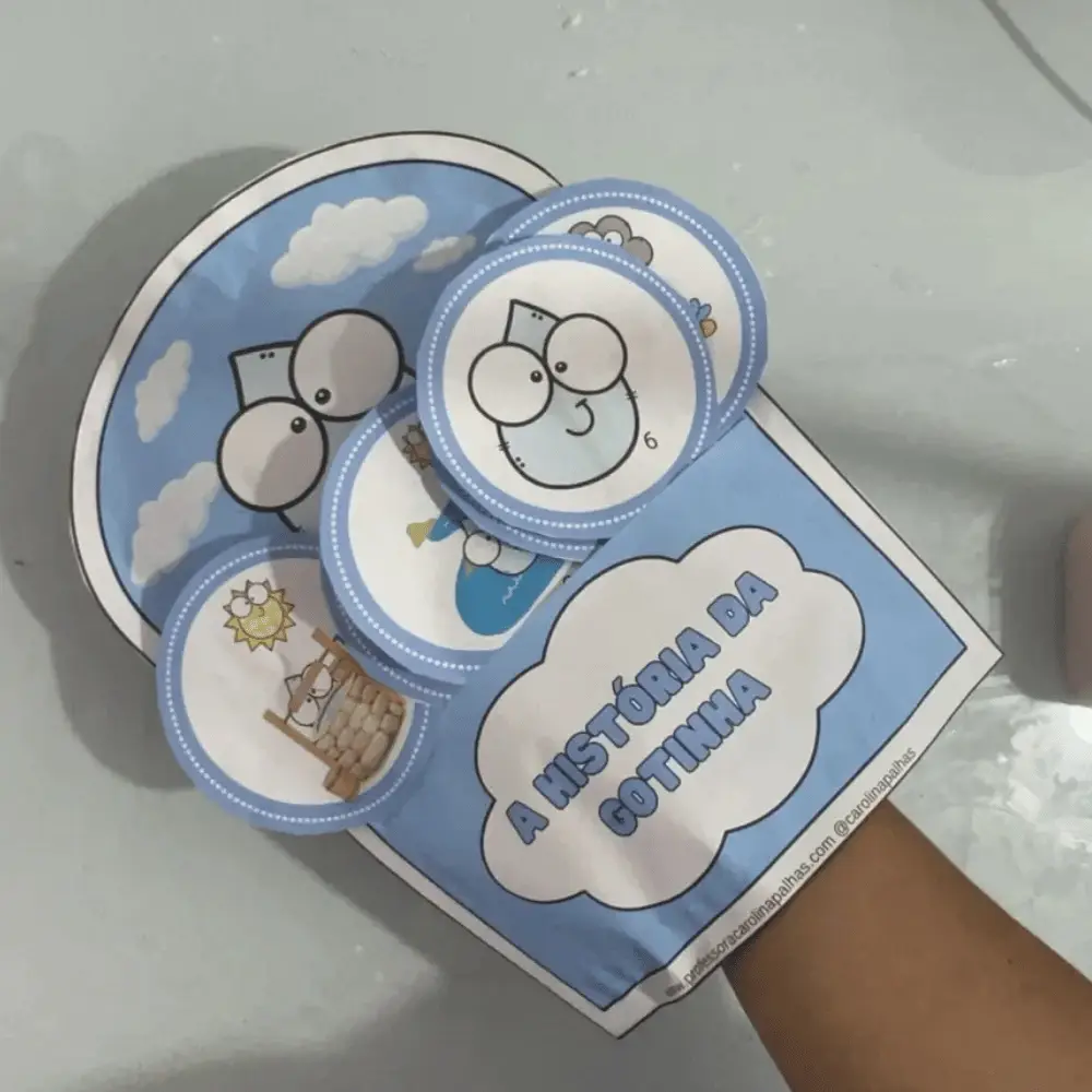 Luva de História “A História da Gotinha” em PDF colorido, pronta para imprimir, ideal para Educação Infantil e Ensino Fundamental 1. Arquivo sem marca d’água.